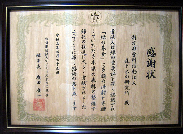 先に森と木の研究所が助成を受けたトヨタ財団の活動助成同様に、大変狭き門となっていますが、プロジェクトの内容が評価されたことは、大変名誉なことであると同時に当研究所の活動に対する皆さん方のご理解の賜物であると感謝いたします。