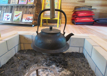 昭和30年代頃まで 鹿児島の都市部以外の地域では、どの家にも囲炉裏(ユルイ)を切ってあり、囲炉裏には、自在鉤(ジゼカッ)が吊り下げられていました。自在鉤には、常時茶ジョカ(茶釜、やかん)が吊り下げられ、囲炉裏に薪が燃やしてあるときは、いつでも湯を使用できる状態にありました。