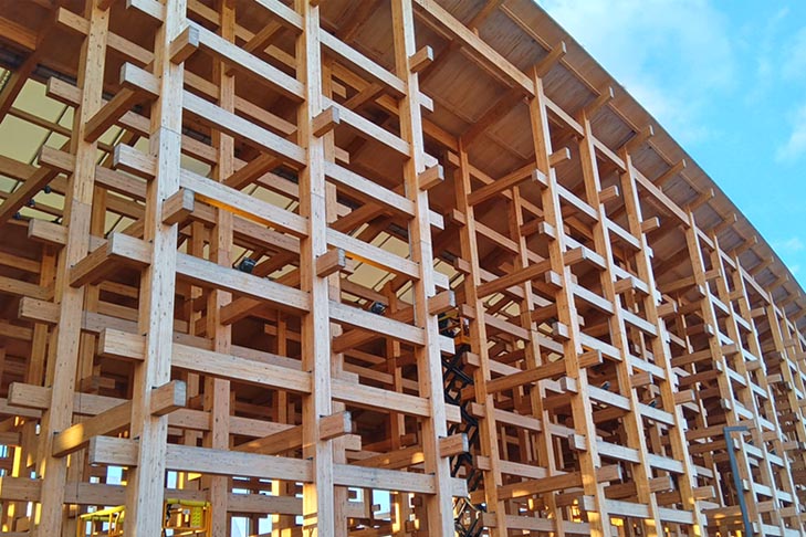今回の万博のシンボルは木製の大屋根リングです。リングの幅30m、一周2Kmで高さは、12m~20mで、上を歩くことができます。使用木材は、スギ、ヒノキが7割でオウシュウアカマツが3割使用されているそうです。工法的には、集成材によるヘビーティンバー貫(ヌキ)工法とでもいえる構造でかなりの木材使用量となっています。
